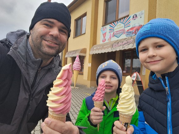 Morava, konec března 2026. “Jestli je toto malá zmrzlina, jak pak vypadá ta velká?” divili jsme se. Na doporučení našeho táty Ivana, tedy dědy z Hodonína, jsme zajeli při návštěvě Hodonína do vedlejší vesnice Mutěnice. To jsme neměli dělat. Zmrzlinu tady dělají docela dobrou, ale velikánskou, přátelé! Fakt velkou!